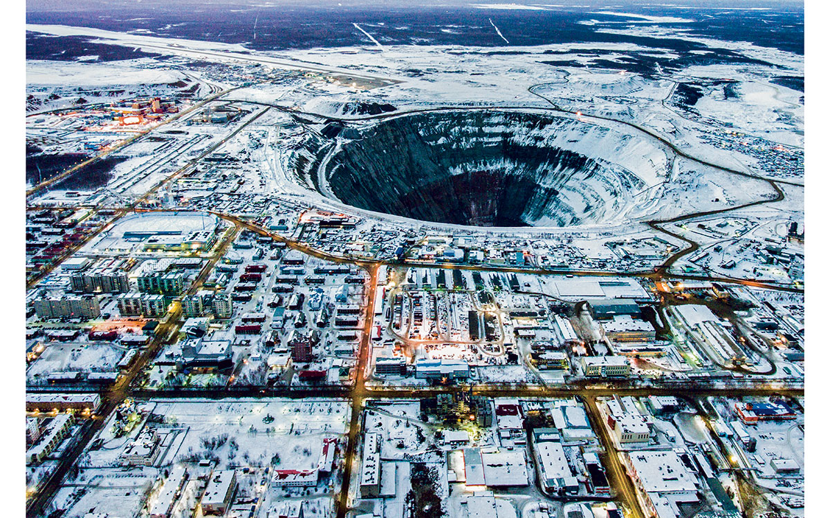 La ciudad de Mirni se extiende justo hasta los pies de la brecha gigantesca. La mina se llama Mir, ‘paz’ en ruso. Tiene un diámetro de 1,2 kilómetros y avanza por el interior de la tierra hasta los 525 metros, lo que la convierte en una de las más profundas del mundo. La mina se adentra en el permafrost como un gigantesco sumidero.